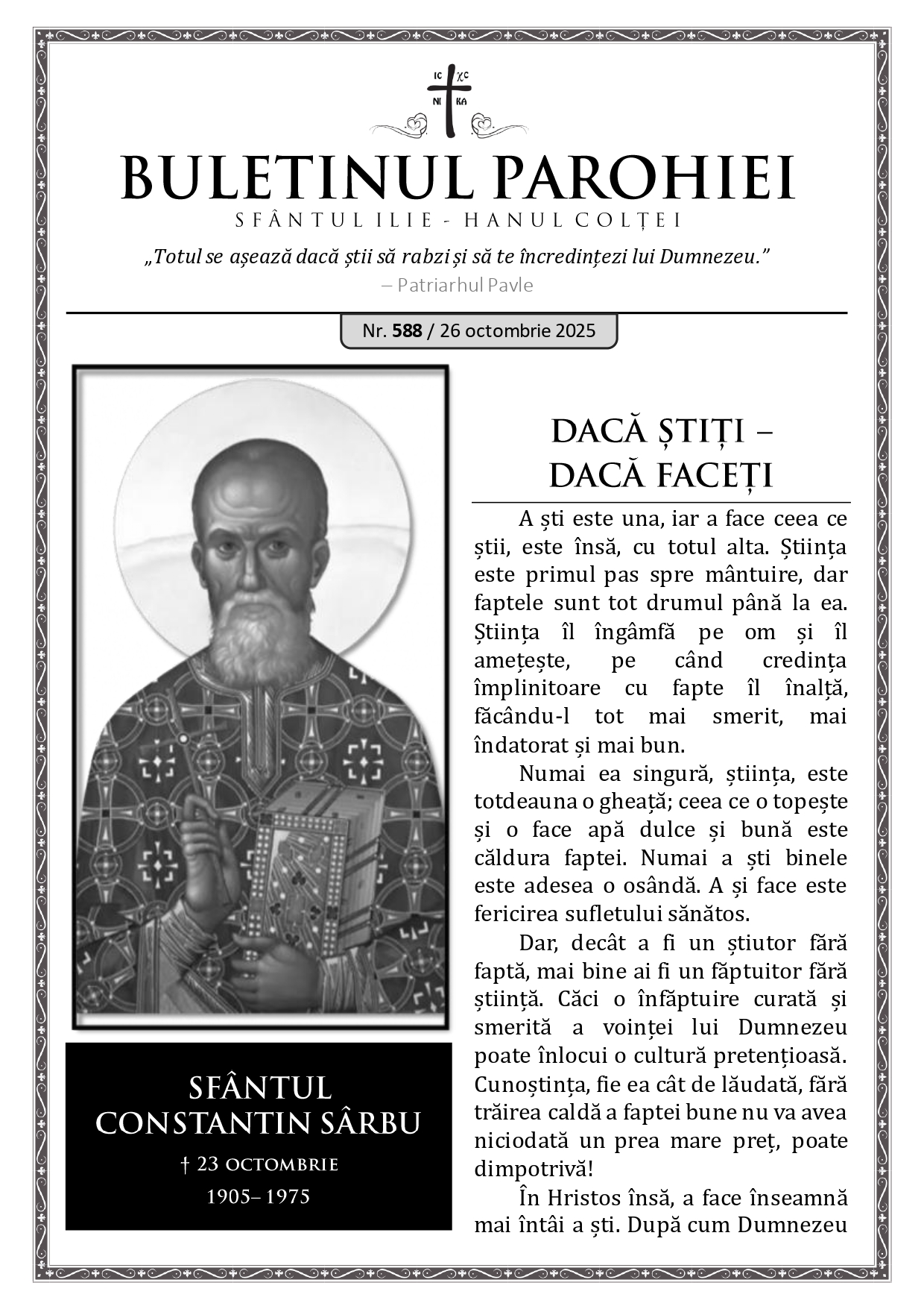 Apropiindu-se de Elisei, fiii proorocilor din Ierihon i-au zis: Știi că Domnul va lua astăzi de la tine pe stăpînul tău pe deasupra capului? Elisei a răspuns: Știu, dar tăceți. Sfîntul Ilie a zis către Elisei: Șezi aici, că Domnul m-a trimis la Iordan. Elisei a zis: Viu este Domnul și viu este sufletul tău, că nu mă voi depărta de tine. Și au mers amîndoi, iar 50 de bărbați din fiii proorocilor s-au dus în urma lor, de departe. Cînd amîndoi sfinții prooroci au ajuns la Iordan, Ilie a luat cojocul său și, învîrtindu-l, a lovit apa cu dînsul și s-a despărțit în două; apoi au trecut amîndoi ca pe uscat. După ce au trecut ei Iordanul, Ilie a zis către Elisei: Cere de la mine ce vrei, mai înainte de a fi luat de la tine. Elisei a zis: Cer ca darul din tine să fie îndoit în mine. Ilie i-a zis: Greu lucru ai cerut; însă, dacă mă vei vedea cînd voi fi luat de la tine, ți se va împlini cererea; iar de nu mă vei vedea, nu ți se va împlini cererea.